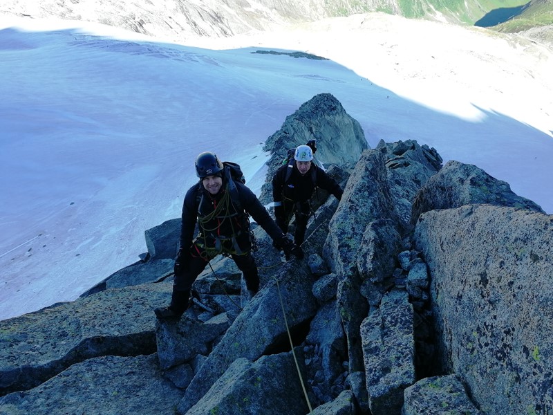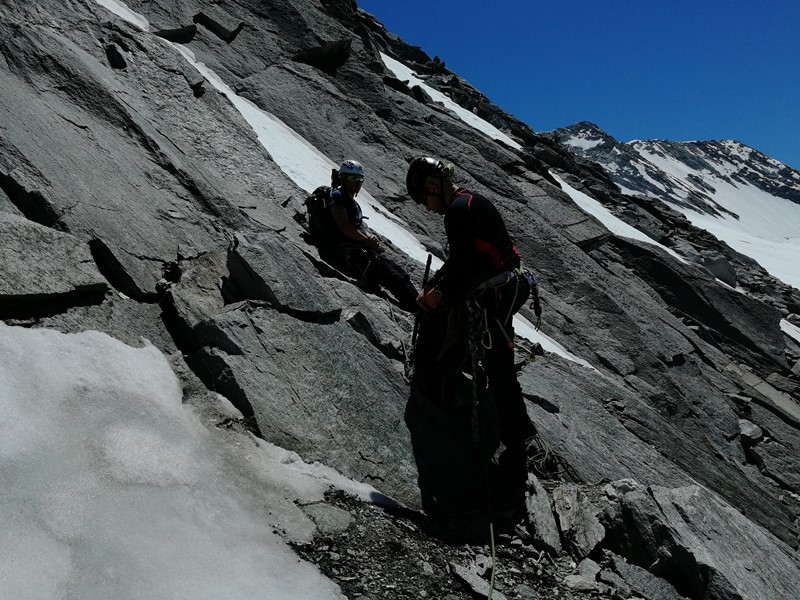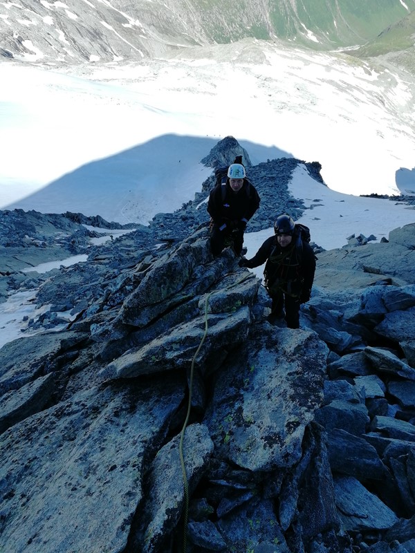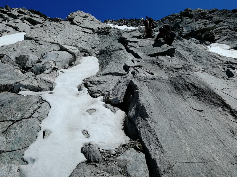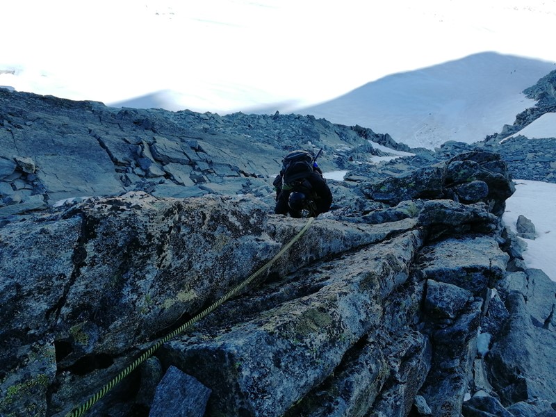 Výškové metry přibývají a začíná se objevovat únavička. Sněhu je poměrně dosti, takže do maček naskakujeme ještě drahně pod ledovcem. Cesta po sněhu je taková dvojaká. Na jednu stranu to poměrně odsejpá, na stranu druhou je to úmorná nuda. Úsek naštěstí není nijak dlouhý. Pod skalní ostruhou zvažujeme co s načatým večerem. Většina skupin, které vyrazili chviličku po nás po noci strávené v pohodlí chaty (jak jinak, kdo by se taky jebal nahoru na jeden zátah, že?) se pouští do sněhového žlábku, my volíme skalní variantu vlevo. V půli kopce se obě cesty jak vidno spojí a my si aspoň užijeme víc skály.