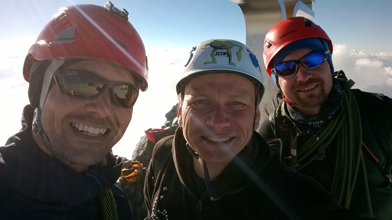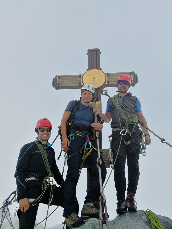 Po plotně nás čekalo už jen pár traverzů a výšvihů, nic zásadního a dříve nepoznaného. Občasné lezení tak za II, jen jedno vysněžené místo mě moc nepotěšilo. O nic zásadního ale nešlo a netrvalo dlouho a už se nad námí leskne zlatavý gipfelkreuz.