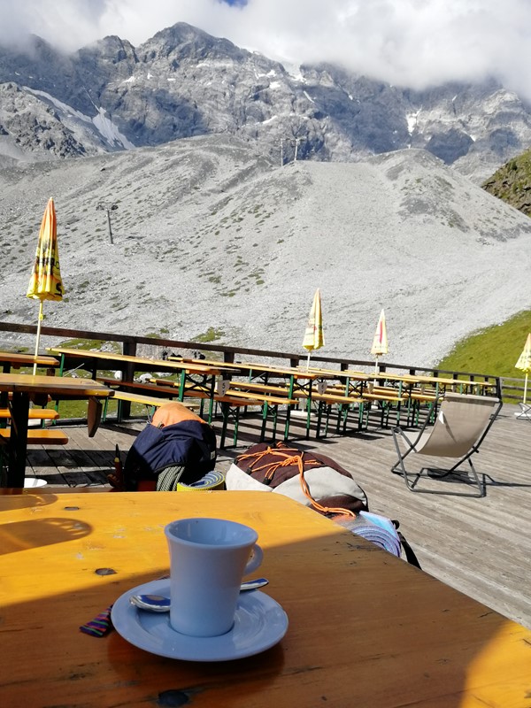 Sedačka startuje v půl deváté, dáváme si proto ráno na čas. V klídku přebalíme matroš, naskočíme na lano a necháme se pohodlně vyvézt ke K2 Hütte, kde zahajujeme náš horský podnik – Venca čajem, Michal pívem a já italskou kávičkou. Z verandy očumujeme severovýchodní stěnu Ortleru a říkáme si, že to je jako docela krpál.