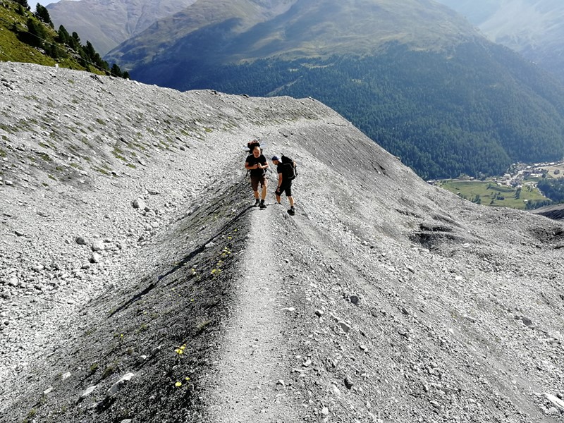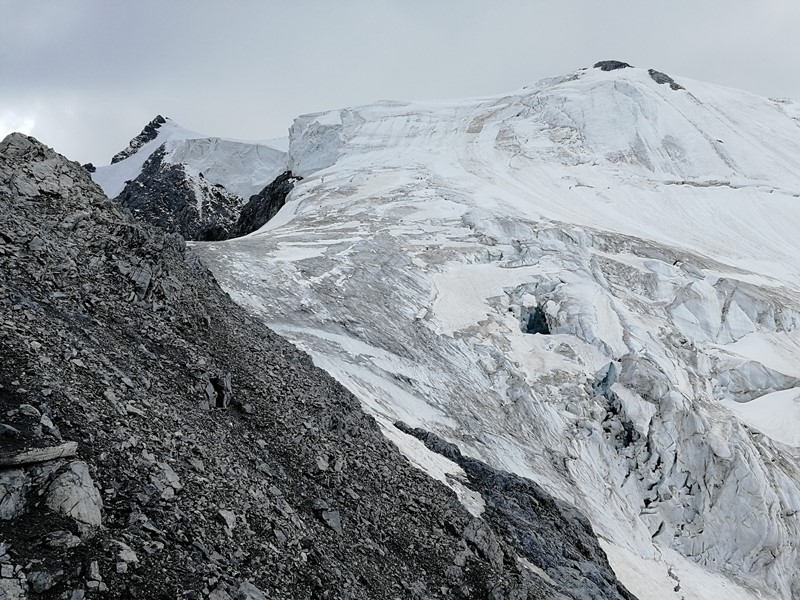 Cesta od chaty dál už začíná být konečně zajímavá. Nedříve suťový traverz, pak krásný hřebínek a nakonec ledovcová hamtárna, na jejímž začátku je na skalní ostruze usazená bivakovací plechovka, která měla být nadcházející noc naším příbytkem. Po občerstvení se pouštíme do poslední fáze dnešního dne.