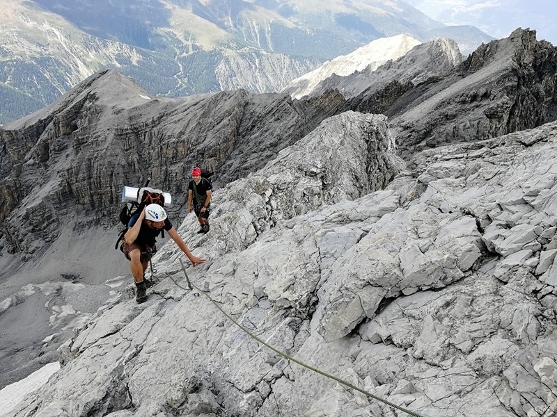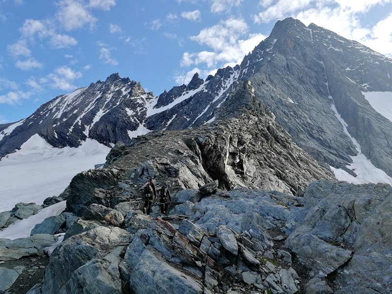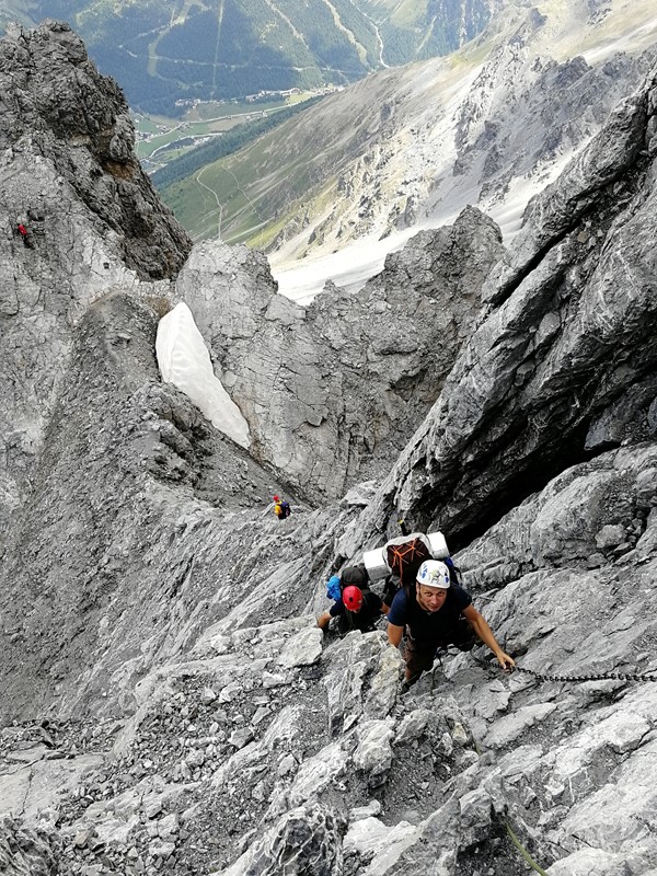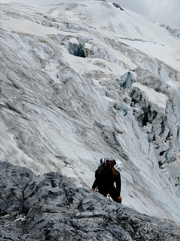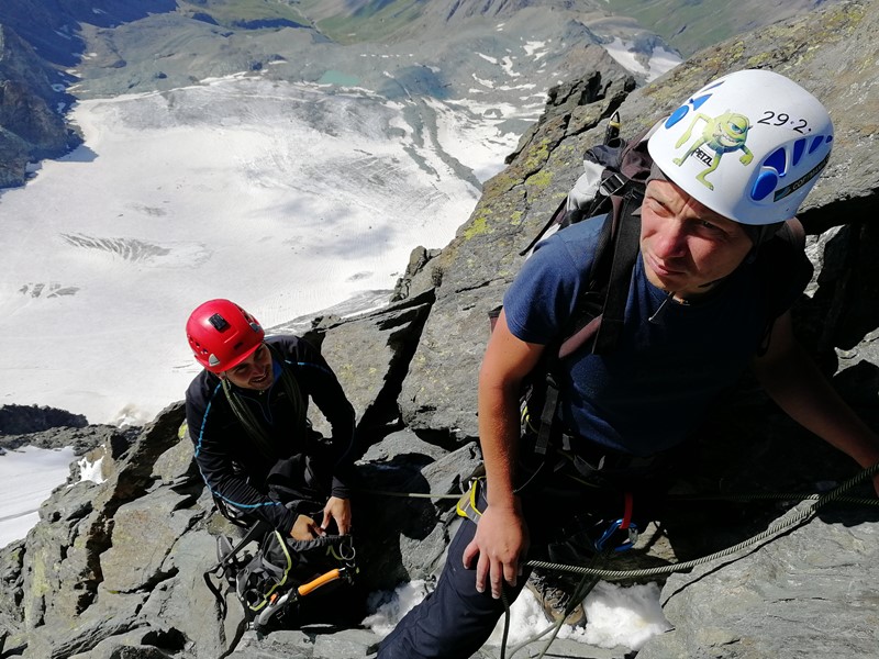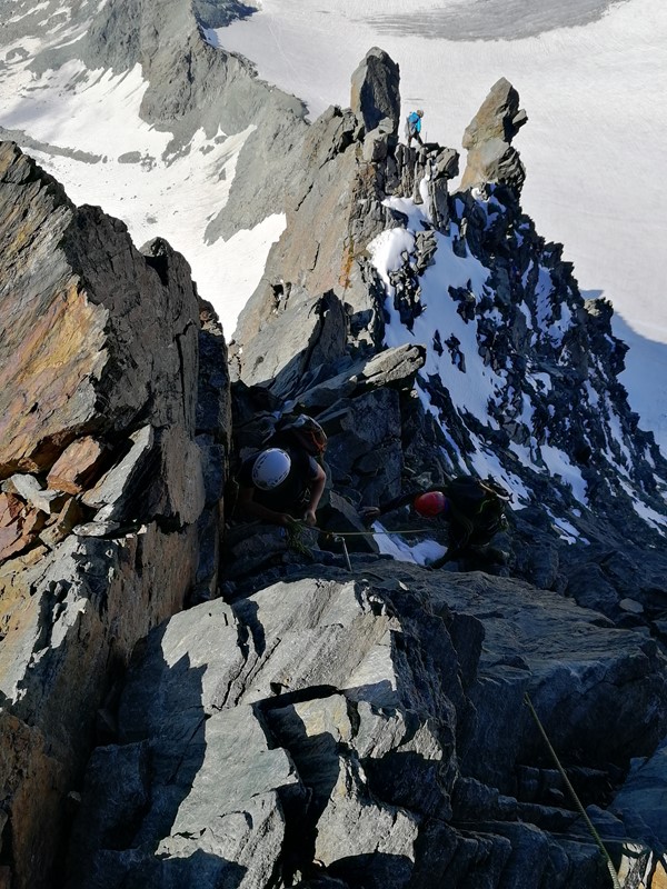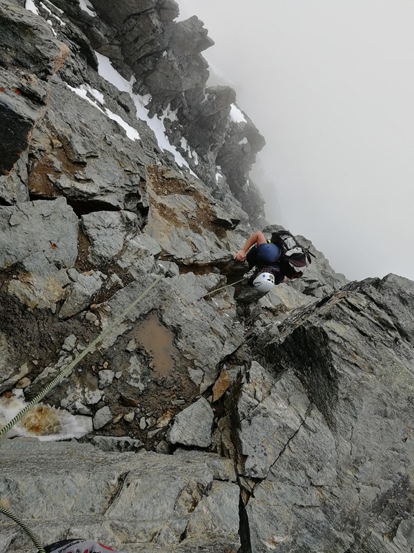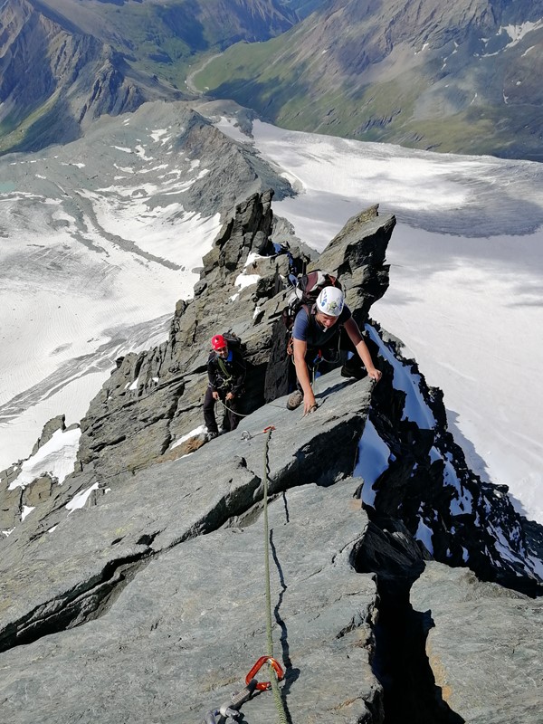 Kousek za chatou pozvolna přituhuje. Chvíli zmíněný traverz, pak pár sestupů a přelezů sedýlek, už to není jen na nohách. Zábava začíná, užíváme si to převelice. První větší výšvih přelézáme ještě bez průběžného jištění, na jednom z vrcholů, kde nás čeká další sestup do uzoučkého sedýlka a následný výstup poměrně komplikovaně vypadající stěnkou se ale pro jistotu navazujeme. Sestup je ale na pohodu a komplikovaný výstup je dobře zajištěný řetězy. Navázáním jsme ale chybu neudělali, protože za výšvihem na nás čeká hřebínek a jistící tyče a občasný borhák. V jednom místě trochu zaváháme, ale Vendys si všimne borháku nahoře ve výšvihu a je po nejistotě. Před nástupem na vrcholový ledovec nás čeká ještě jedno sedlo s následným výšvihem a už obouváme mačule.