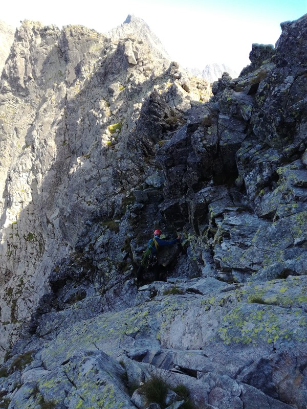 Cesta žlabem je podle tatranských zvyklostí. Shnilá skála ale nečiní velké potíže, sklon je pohodový a jde se dobře. Těsně pod vrcholem jsou v plotnách kramle, bez kterých by to asi bylo výživnější. Jedna preska v traverzu holky uklidní a netrvá dlouho a stojíme na vršku, kde se na nás culí vrcholový kříž.