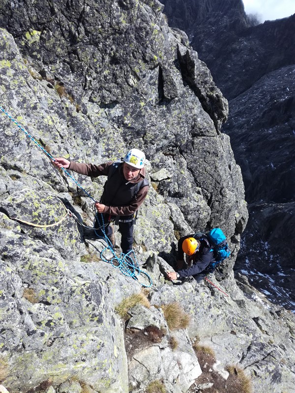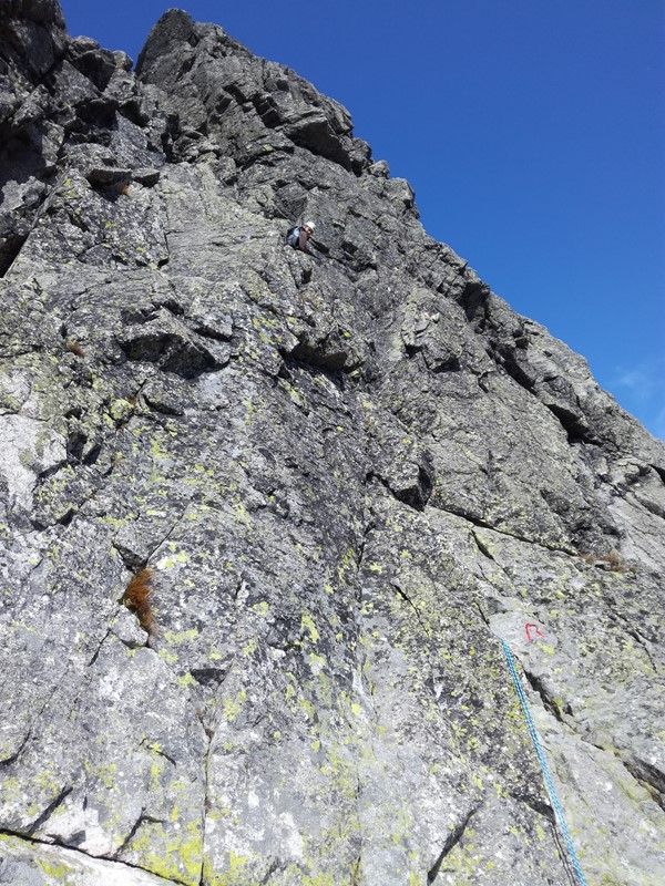 Ze štrbiny na vršek to je co by dočůral a zbytek doplivl, takže za pár minut už čučíme z Malého na Velký. Vypadá to vcelku zajímavě a vůbec ne jednoduše. Není ale čas ztrácet čas, po travnatých poličkách sbíháme dolů k Loktibradě a pouštíme se do stoupání na Pyšný štít. Nakonec to není žádná velká věda, na straně Zmrzlé doliny vylezeme pár lehkých výšvihů a za dalších pár minut už stojíme na vršku. Tam potkáváme smíšenou dvojici, která si odskočila z Jordánky. Povinné selfie a spěcháme za dvojicí předpokládajíce, že vědí, kde jsou slaňáky do Bachledky. Nakonec ani toto není žádná trága, slaňák je logicky umístěný a přístup k němu naprosto jasný. Slanění 3x 10m a jsme dole.