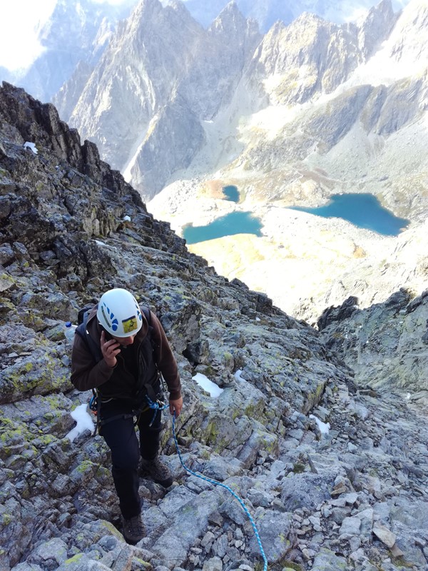 Dole nás vítá omletá plotýnka, za ní se ale terén hned uvolní a poměrně pohodlně docházíme k větvení žlabu. Přecházíme doprava a co nevidět už stojíme v Jordánově štrbině a napojujeme se na už známou cestu. Průlet přes řetězy je po včerejšku svižný a za krásných téměř 5 hodin od chaty stojíme na vršku. 5 hodin, no fuj!