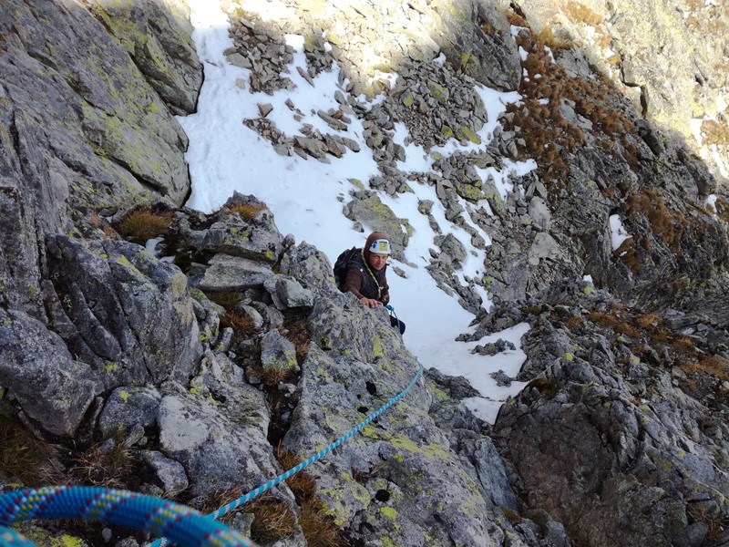 Od chaty stoupáme přes hrb jihovýchodním směrem a nastupujeme do posledního kuloáru mezi Pyšným a Lomnickým štítem. Zprvu je cesta celkem jasná a logická. Zhruba v třetině nás to ale nějak nenápadně vtáhne doleva a než se nadějeme, jsme pěkných pár metrů nad dnem žlabu. Není to ale nic hrůzného, tak pokračujeme dál. Tu výšvih, tam výšvih, postupně to ale normální cestu přestává připomínat.