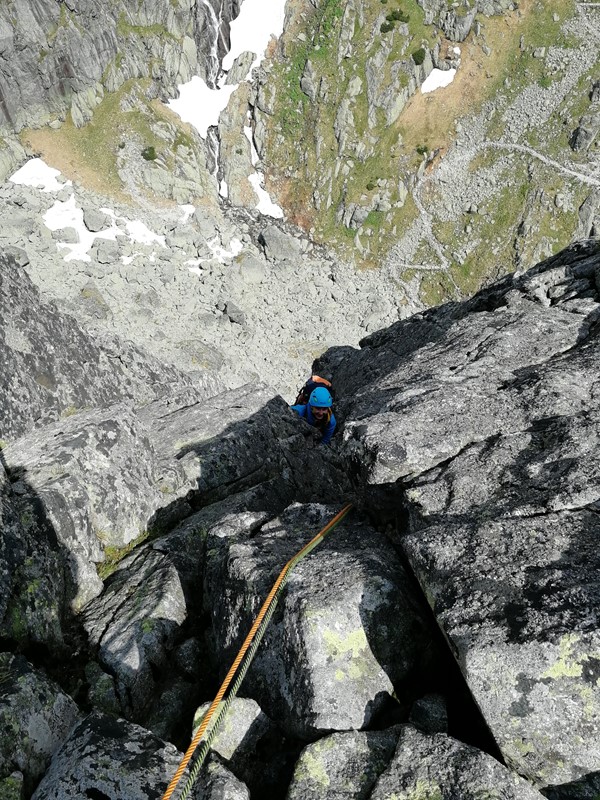 Poslední část – travez a komín na hranu už nedává prostor pro zmýlení. Dolézáme, fotíme, svačíme, kocháme se. Úbočím dolejzáme na vrchol a zahajujeme sestup. Volíme skalní variantu napravo (ve směru sestupu) od žlabu. Je to tak za II, ale jak je to celé podmáčené, tak je to vcelku zážitek. Za 20 minut jsme ale v bezpečí dole, kde se setkáváme s druhou skupinou, která stejně úspěšně zdolala Malý Ledový štít.