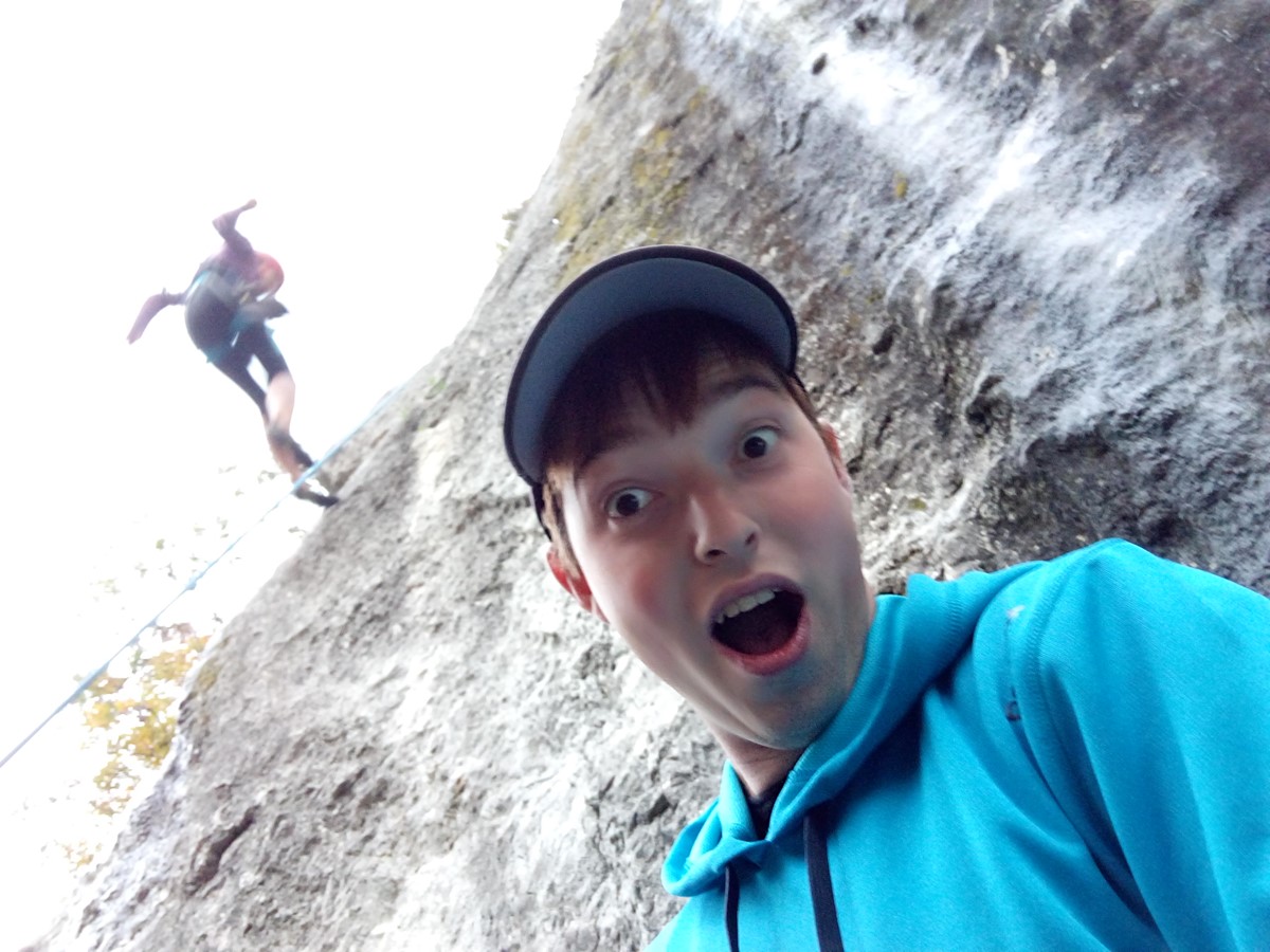 Druhý den naše družtvo doplnil také hrdý člen B týmu Tomáš. Ten den jsme odpoledne lezli na takových obřích balvanech a jestli jsem předtím psala, že v Belvederu nebyly chyty, tak tady to bylo ještě horší. Tady se ruce vlastně používaly jen na vyrovnání rovnováhy, jinak se postupovalo hezky po malých krůčkách. Měla jsem možnost si asi 3 cesty tady vytáhnout a dlouho jsem si nic tolik nevyčítala. Ale opět - když jsem ty cesty dolezla měla jsem z toho fakt dobrý pocit a byla jsem hrdá, že jsem to hladký sklo přelezla. Vzpomínám si i na jednu fotku, která ten dobrý pocit na konci krásně zachycuje.