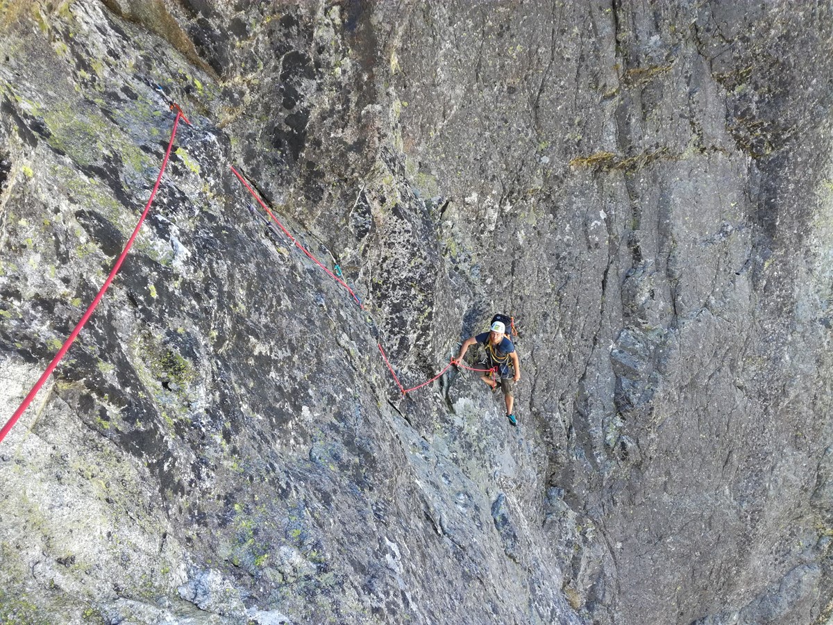 Přeházíme lano a pokračujeme. Poslední část už je jen o výšvihu kolem uvolněného Damoklova balvanu ve stylu velké dlaždice přímo nad stanovištěm, pak pár kroků v traverzu, proti předchozímu na pohodu, nulla problema! Pak hore komínem asi za III a štand už na hraně stěny v trávě. Michal dolézá bez problému, balíme, fotíme, něco pojíme, po ramenou se plácáme a tak dále, a tak dále.