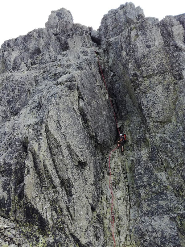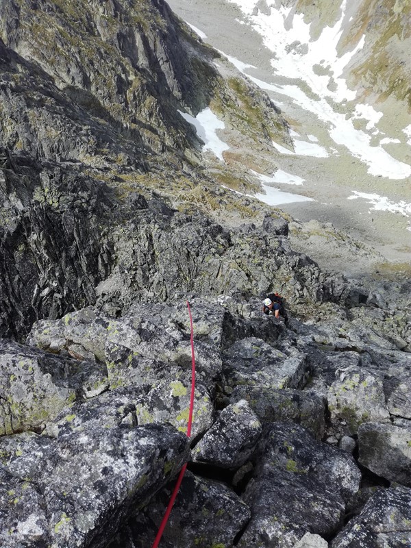 Dubke mě překvapil. Je to vlastně široký chodník, takže svištíme hore jak namydlení blesci. Kousek pod Sedlem za Prostredným odbočuje kuloárik doleva nahoru. Při obhlídce z Pfinnky vypadal přísně, odsud pohoda. Jen si nejsem jist, jestli vážně tudy. Ale jdeme, kdyžtak se vrátíme. Za chvíli vidím nýt, takže jdeme dobře - asi gajdi na přijištění když je tu ještě firn. Ve žlabu sice občas nějaká ta suť trochu zazlobí, ale to není v Tatrách nic neobvyklého. Jdeme ale raději po skále vpravo, tam je skála pevnější. Nakonec výšvih a jsme mezi Malým hrotem a Středo-hrotem.